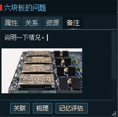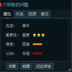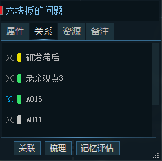 这里会保存所有关联后的碎片链接,删除碎片关联的方法,就是再关联一次已经关联的碎片(此时会提示删除关联)。值得特殊注意的是,蓝色关联符号表示 “对方对我来说很重要(紧密关系)”,灰色关联符号表示 “对方对我来说不重要(稀松关系)”