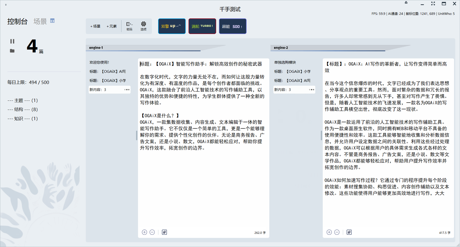 这里使用了双擎模块,两个 AI 引擎同时连续写作: