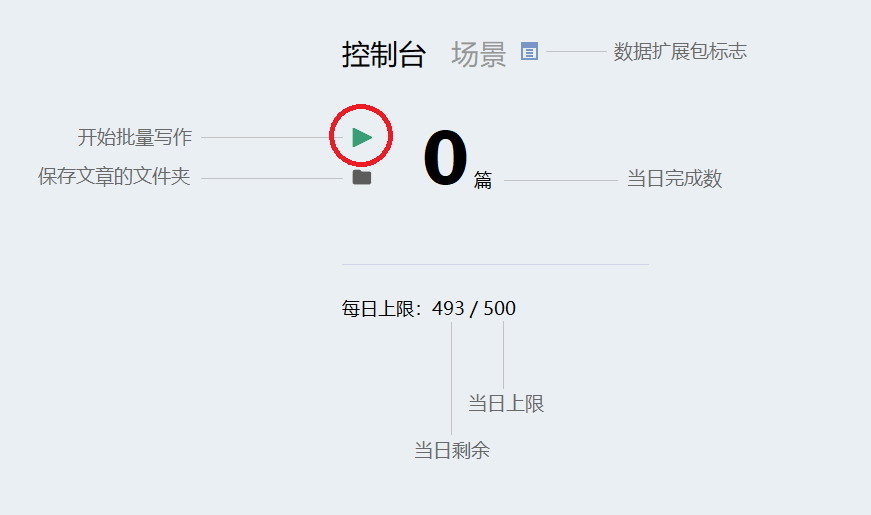 在填充场景数据之后,按一个开始箭头便能轻松批量写作了: