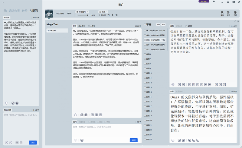 第一层操作区:记忆矩阵组织材料。想象一下,你有一个专门的界面来管理你的所有文本内容——无论是草稿、最终稿还是灵感片段,都可以在同一个地方进行收集、编辑和管理,无需频繁切换窗口,省时省力。
